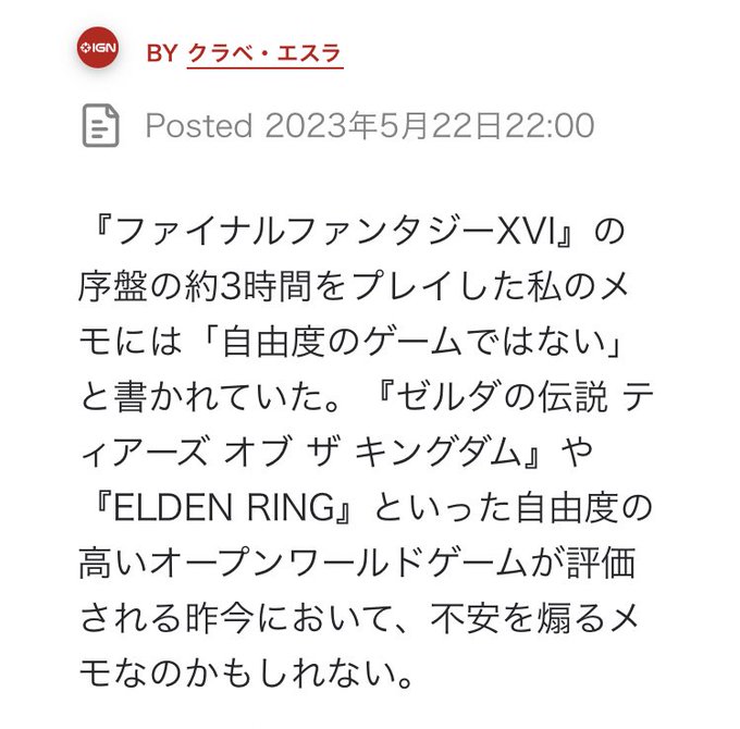 これだけ読むとゲームといったら“登場するNPC全てと会話できて剣で無意味にタルを壊すことが出来る“ものしかプレイしたことがなく、特にそこに面白さを見出してしまった異常者が書いたFF16の感想にしか見えない。